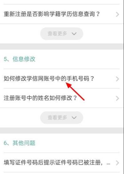 3、在列表中找到“信息修改”选项,点击进入后选择“如何修改学信网中的手机号码?”