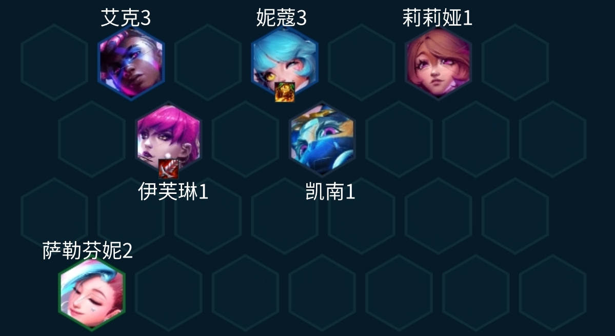 3-2升6,6人口基本阵容搭配有了,就差后面的阿卡丽和阿狸,这时候我们基本需要一路过度到8级去找卡了,所以这时候有的装备就可以先做直接带上稳血量升级,伊芙琳带阿卡丽的装备,阿狸装备可以给萨勒芬妮带,后面阿狸带了可以卖掉换下装备给阿狸带,所以后面抓卡可以备战席留萨勒芬妮替换。