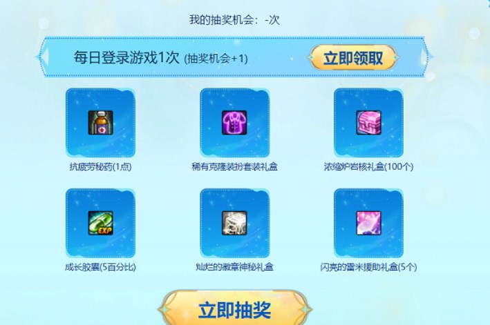 每日登录游戏1次即可获得1次抽奖机会,消耗抽奖机会即可抽取奖励。