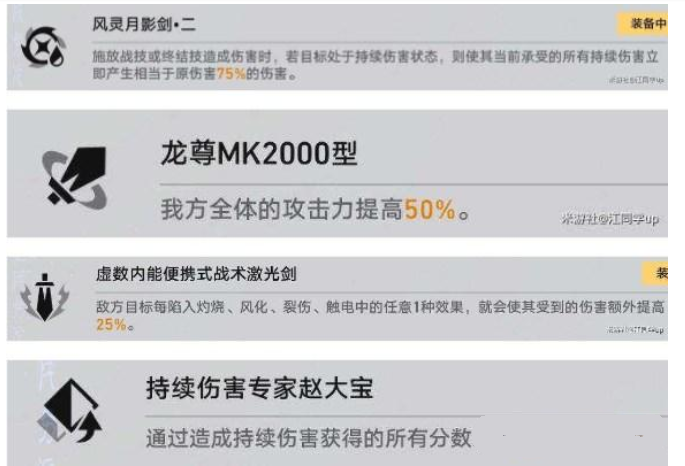 1.4个角色光环,选择【碎星绝尘剑·二】【龙尊MK2000型】【无根纯水(全糖加西米露)】【追击专家赵大宝】,其中第2个也可以换成下面加暴击率的