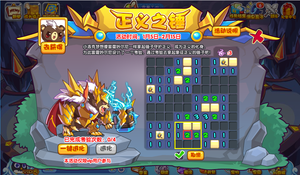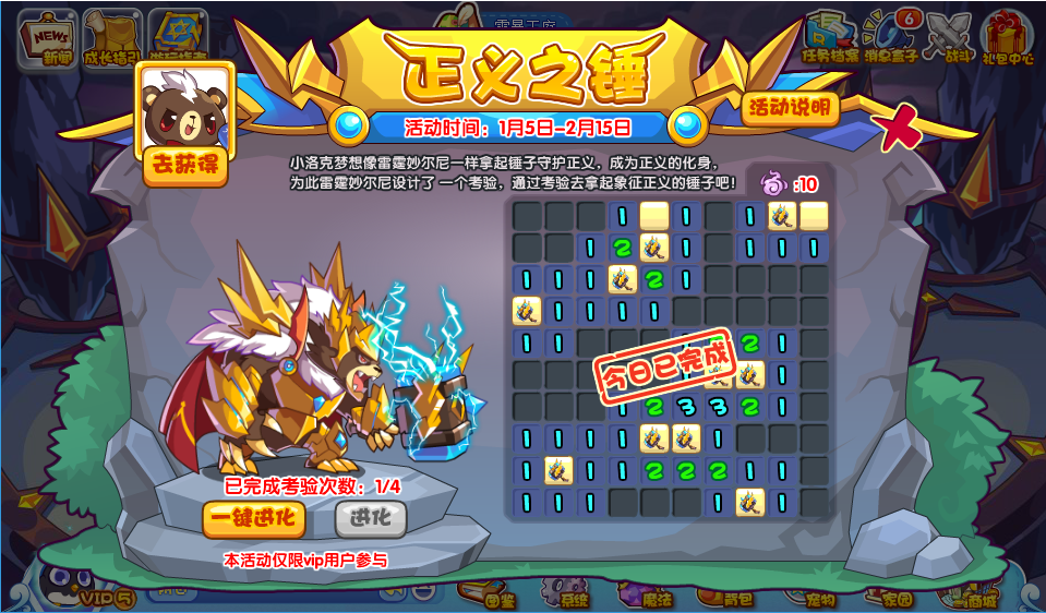 本期VIP专属活动,小洛克们通过雷霆妙尔尼的考验,就可以开启他的进化资格哦!另外此阶段可以破茧重生,成为苍雷妙尼尔!