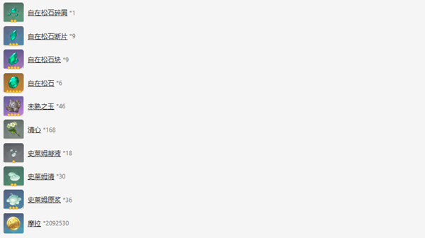 3、50级突破材料:60000摩拉,自在松石断片×6、未熟之玉×4、清心×20、史莱姆清×12。