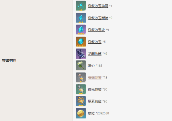 80级突破材料:哀叙冰玉6、龙嗣伪鳍20、清心60、原素花蜜24