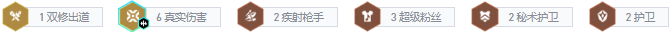 2、羁绊:1双修出道、6真实伤害、2疾射枪手、3超级粉丝、2秘术护卫、2护卫
