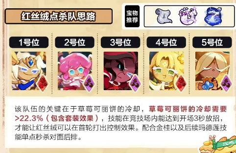 1.该队伍的关键在于草莓可丽饼的冷却,草莓可丽饼的冷却需要>22.3% (包含套装效果)