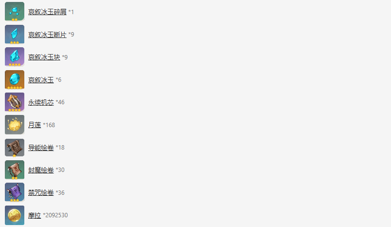 50级:6w摩拉,6哀叙冰玉断片、4永续机芯、20月莲、12封魔绘卷。