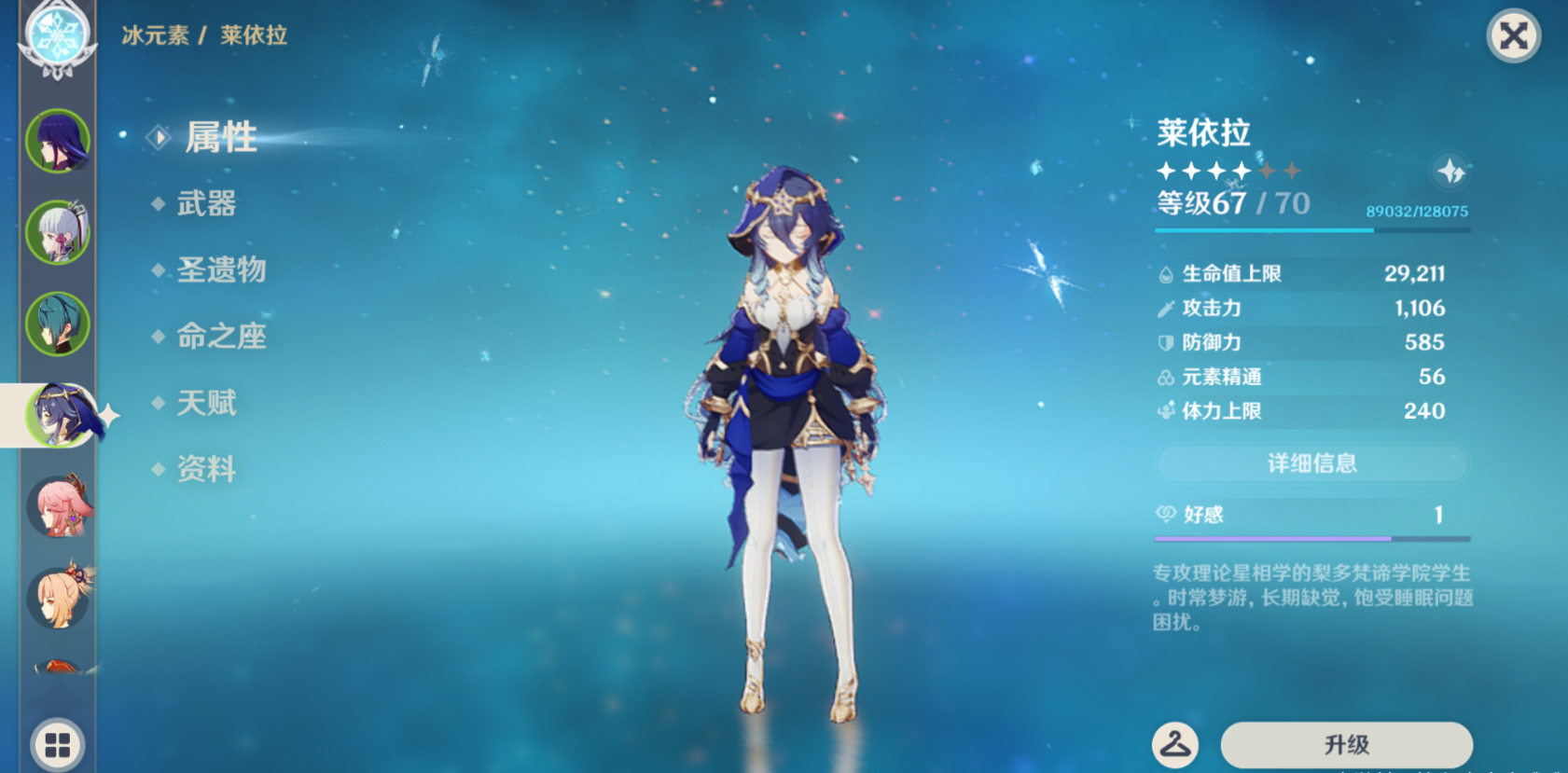 1、首先莱依拉可以提供护盾效果,同时又是冰可以提供元素精通,并且拥有爬墙能力,适合跑图。