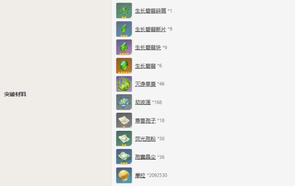 80级突破材料:120000摩拉、生长碧翡6个、无相之草掉落材料20个、劫波莲60个、孢囊晶尘24个
