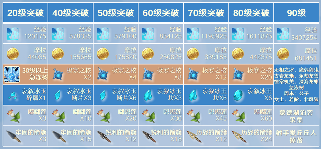 60级:哀叙冰玉块*3,极寒之核*8,嘟嘟莲*30,锐利的箭簇*18
