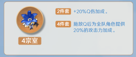 2、四件套效果:释放元素爆发后,队伍中所有角色攻击力提升20%,持续12秒,该效果不可叠加。