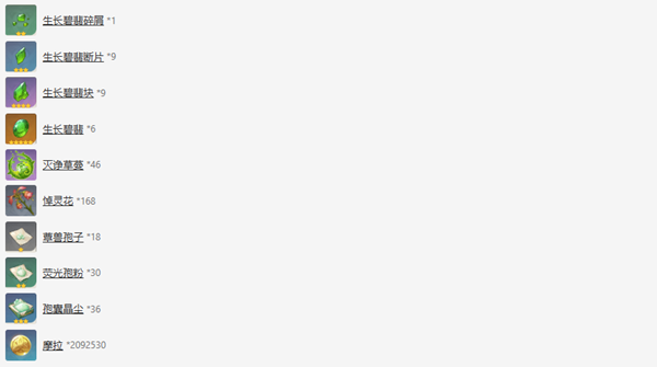 5、70级突破:100000摩拉、生长碧翡块6个、灭诤草蔓12个、悼灵花45个、孢囊晶尘12个。