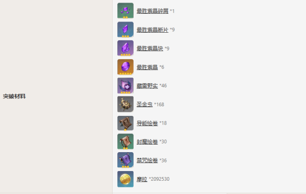 60级突破材料:最胜紫晶块3、藏雷野实8、圣金虫30、封魔绘卷18