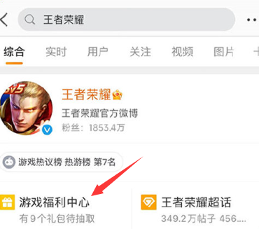 1、微博搜索【王者荣耀】,点击下方的游戏福利中心