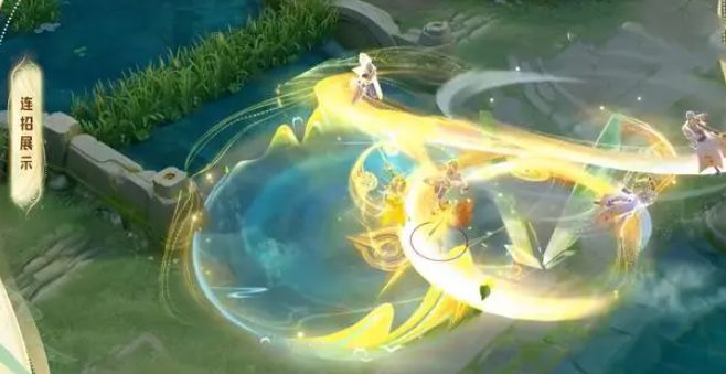 二技能:金色能量丝线连绵环绕水面,倒映出琉璃幻景;在圈中移动时,可以从不同角度观看盛景奇观。