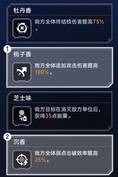 解析:栀子香可以增加我方全体的追加攻击的伤害,可以非常有效的增加真理医生的输出伤害,而沉香可以更好的帮助你击破敌方的弱点,最大效果的去发挥阮梅的能力。