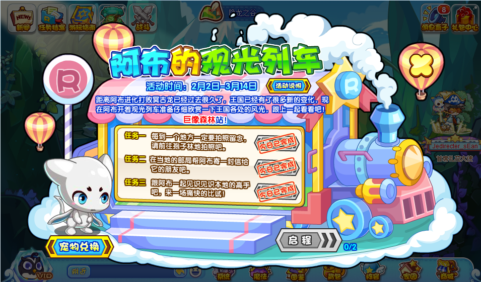 活动一共会出现七个地图,每天阿布只能观光两个地图,每个地图有三个小任务;小洛克们作为这趟列车的领航员,自然要扫清一路的障碍和满足阿布的愿望: