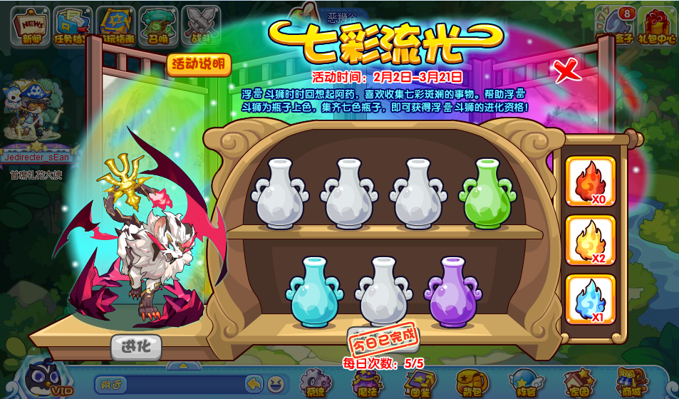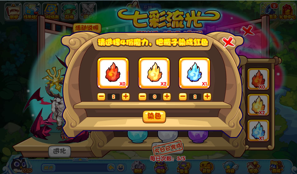 在为瓶子上色前,我们需要收集三原色的魔力火焰,点击“获取魔力”挑战浮罍斗狮,战斗胜利就能获得三色魔力火焰中的随机三个色,一天总共有五次挑战次数。