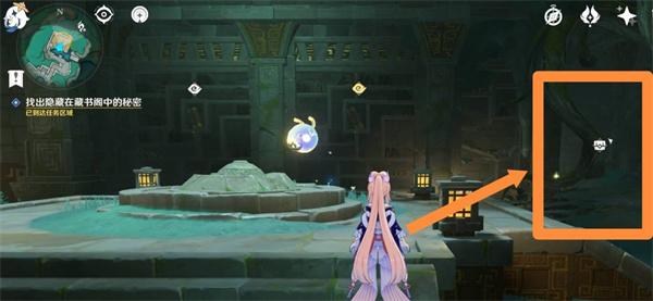 进入最里面,如图所示位置,打掉蜘蛛网上的蜘蛛,进入宝箱所在位置,阅读旁边的书籍,直到阅读完。(完成谜题“将对应元素的书,放入对应的元素框中”,通过元素视野进行,发现少一本元素书,记得向后看)