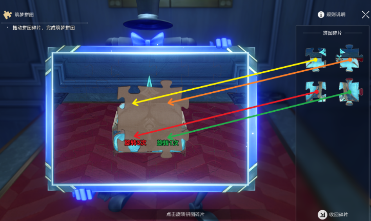 (1)绕着场地一圈拼好4个拼图,拼好后回到酒塔处