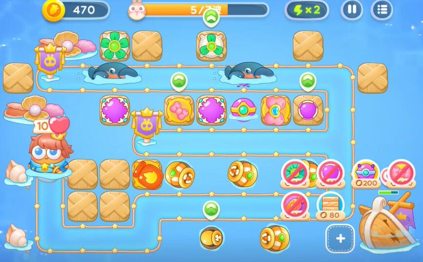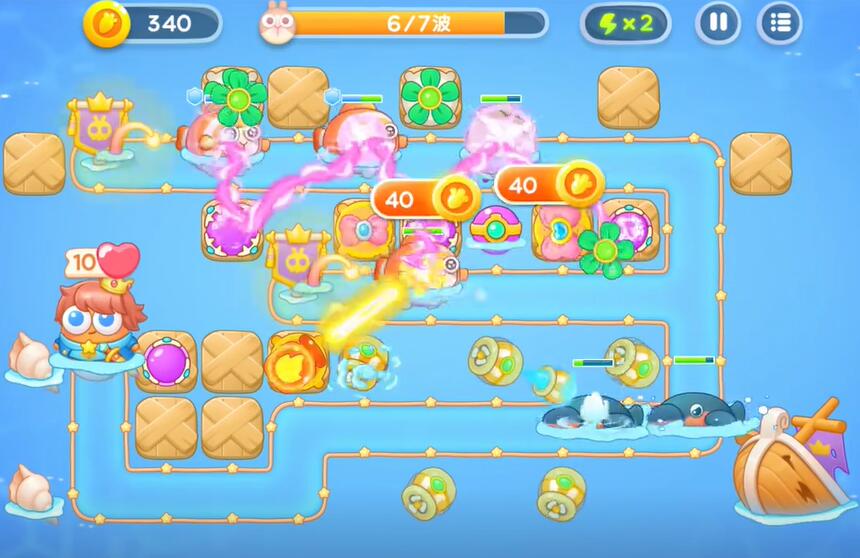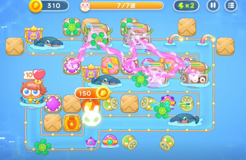 4、补充各种类型的输出防御塔,提升对兔子的伤害,比如蝴蝶结和电击塔。对各种那类型的怪物进行输出。