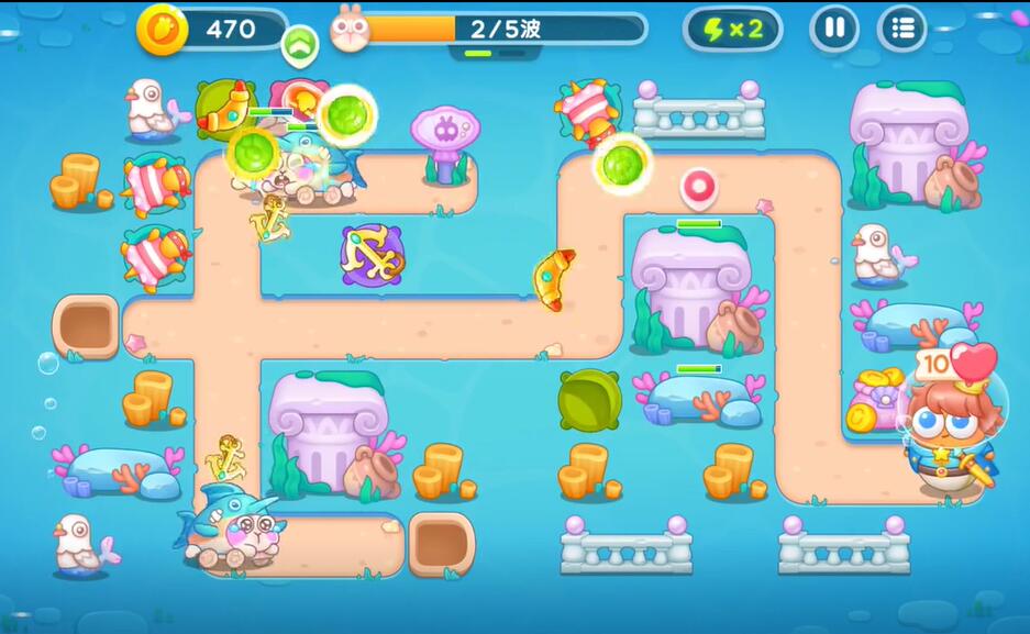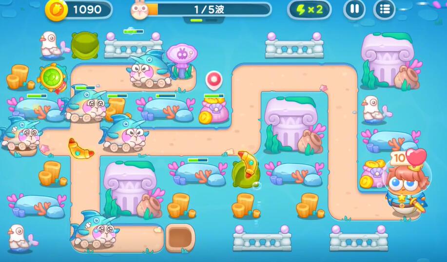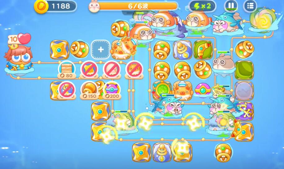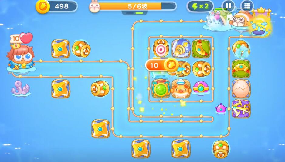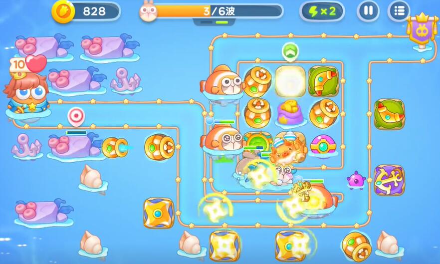 3、在左上角建造鱼雷塔对水下的兔子进行攻击,建造水雷塔,对经过的敌人造成伤害,随后在左下方建造飞镖塔清理左侧的大型障碍物。