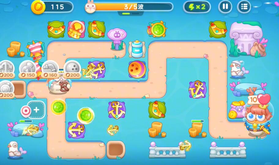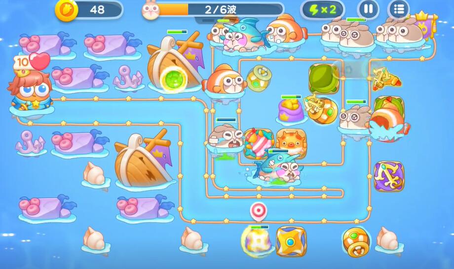 1、利用从第一轮提供的回旋镖和船锚清理掉障碍物,建造鱼雷对水下的怪物进行打击,搭配第一轮的塔守住第一波。