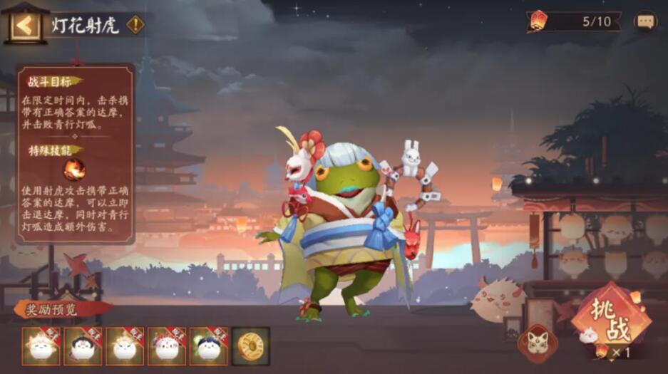2、参与【灯花射虎】玩法,在限定时间内击败带有正确答案的达摩获得花灯。