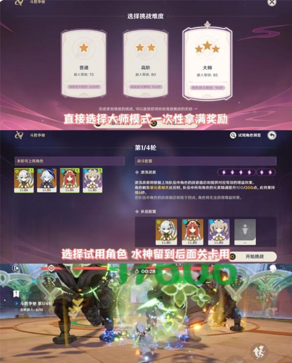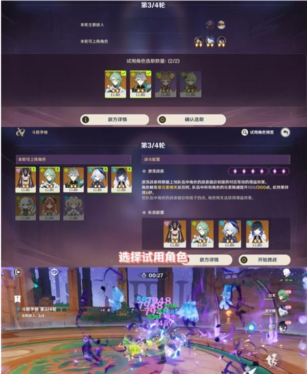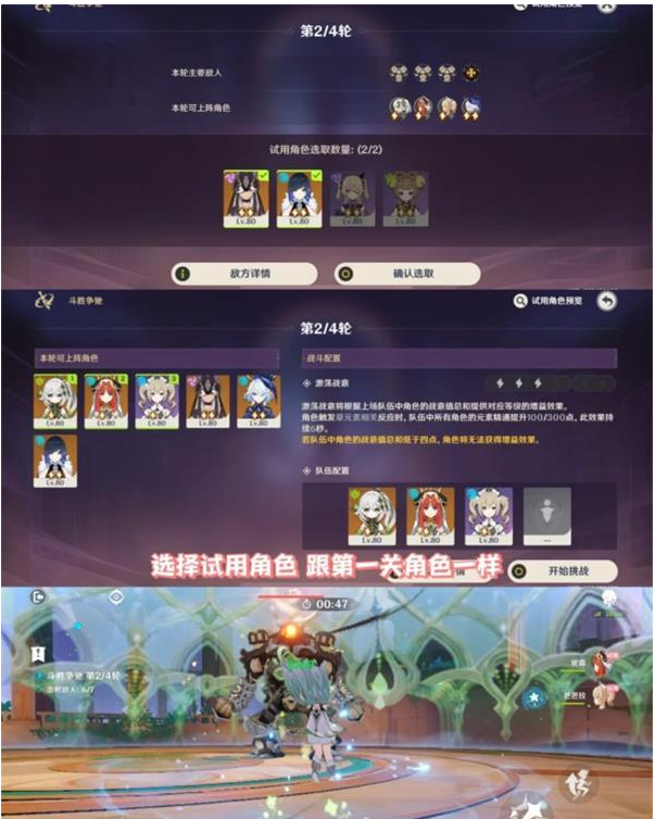 4.第二轮试用角色跟第一关一样,草神妮露依次qe,注意连接所有敌人,芭芭拉前台挂水。