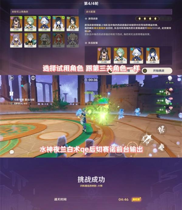 6.第四轮试用角色跟第三关一样,水神夜兰白术qe后切赛诺前台输出。