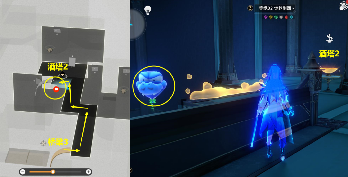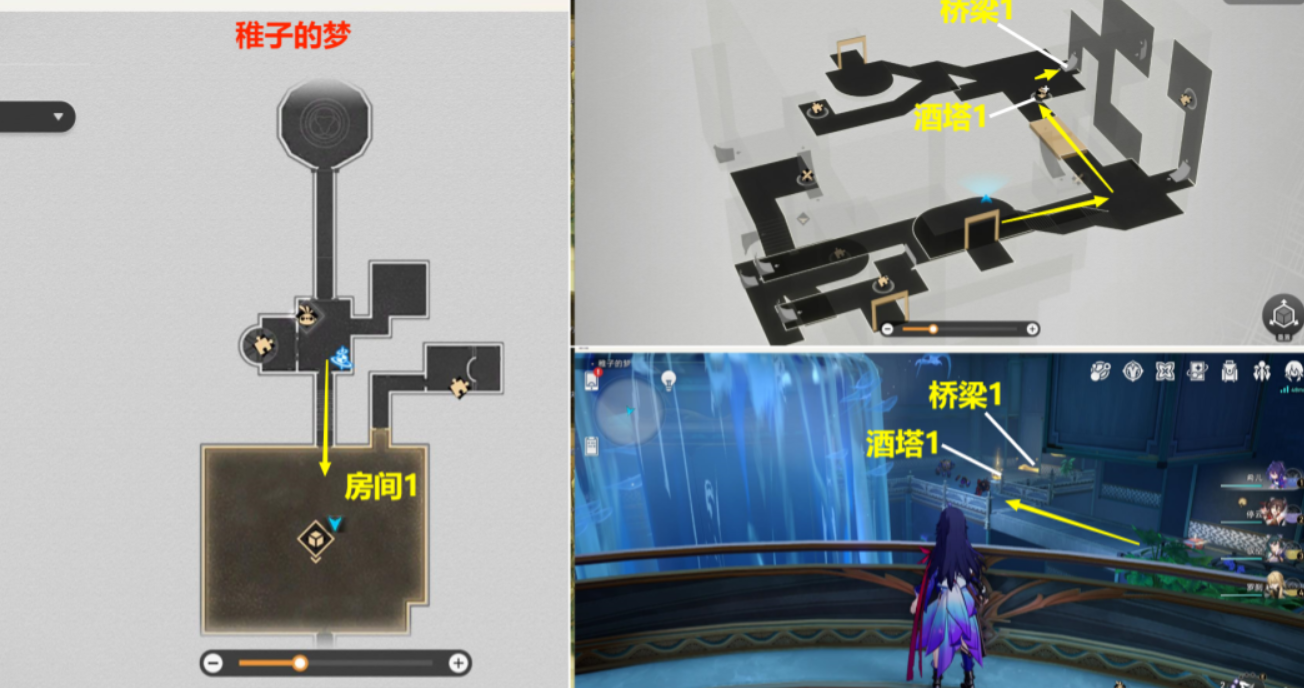 先进入【稚子的梦】下图位置【房间1】里面,进入后,右边下去,从【酒塔1】获得次数后,从【桥梁1】上去
