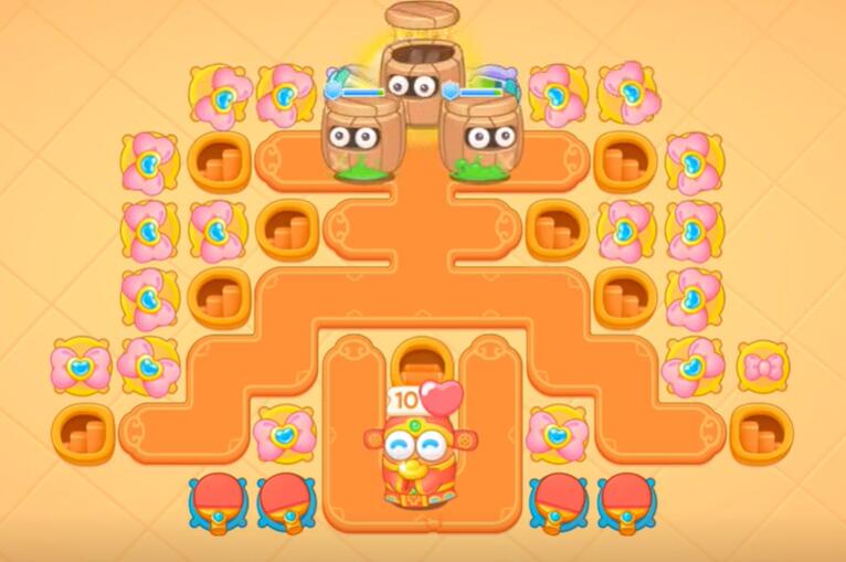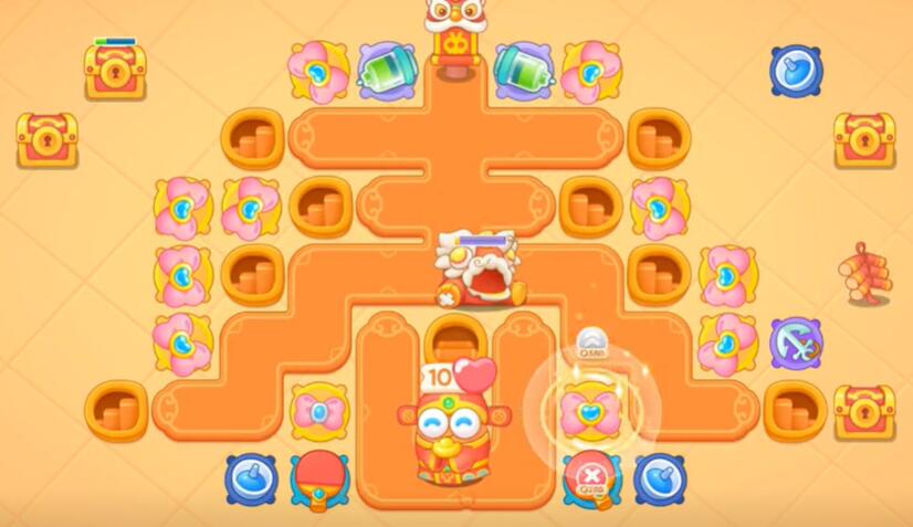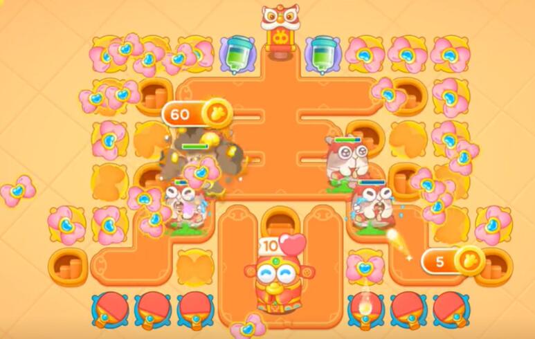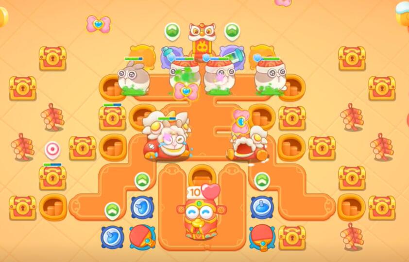 2、在上方建造两个蝴蝶结清理怪物的同时利用群攻对周围的障碍物进行输出,在下方的左侧建造乒乓球清理障碍物。