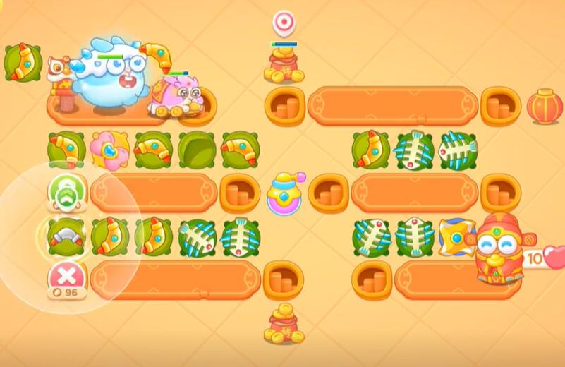 3、在中间补充鱼骨和回旋镖,对兔子进行清理,同时右侧的回旋镖清理下方的障碍物。