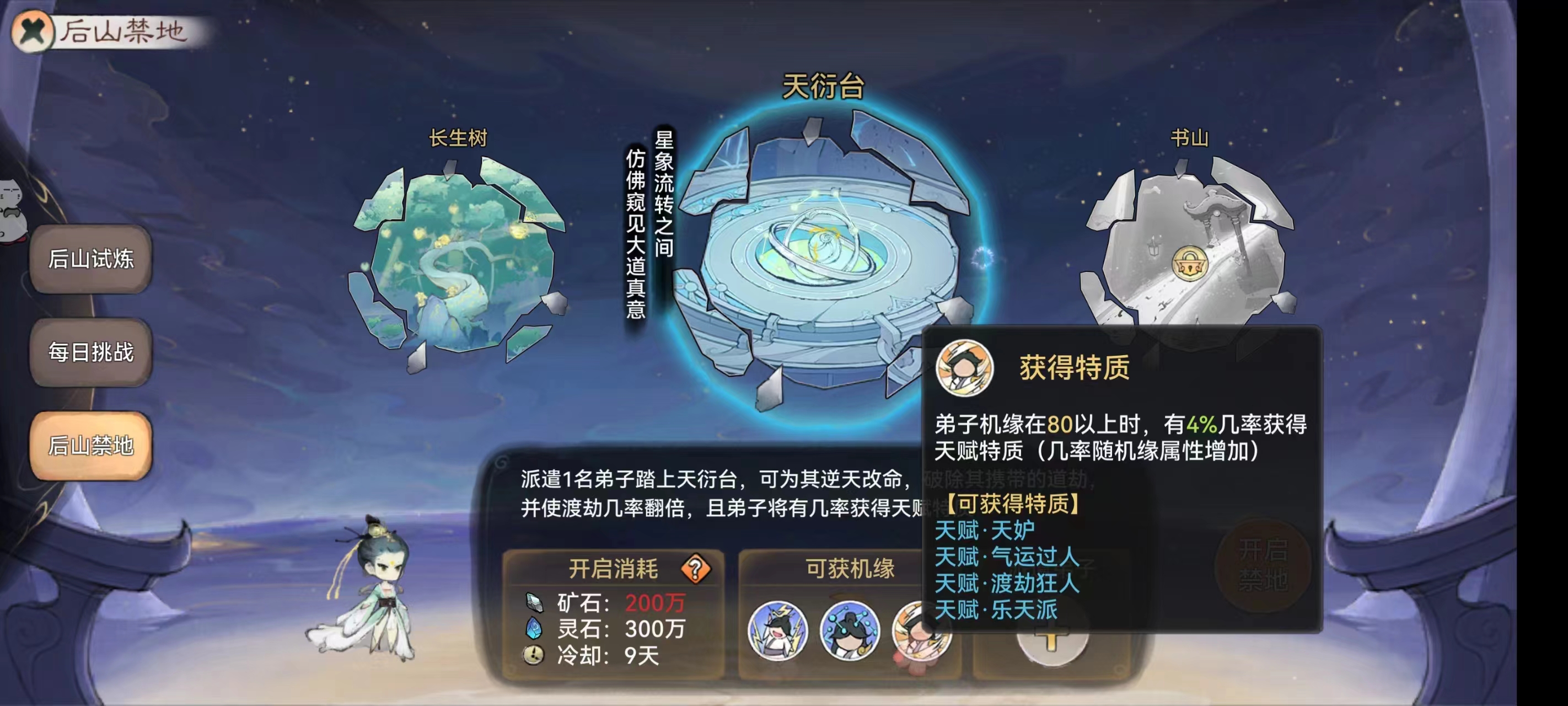 3、而且机缘到80点,可以去后山的天衍台,有几率获得极品词条天妒——潜力、资质、根骨、聪慧各加5点,九转必红的逆天词条。还有其他的词条锦上添花,有兴趣论坛自查。