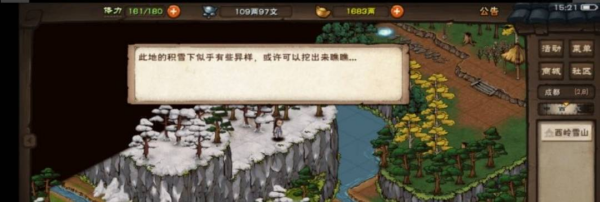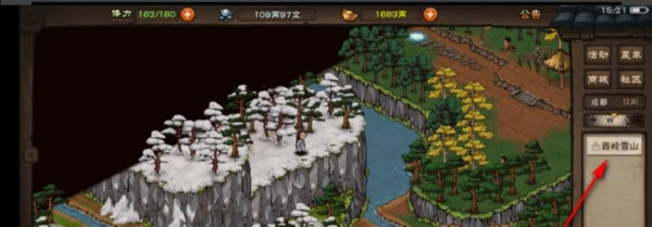 2、接下来,依照纸条上记载的线索,玩家需要运用角色的轻功技艺穿越至成都地区的西岭雪山场景。在西岭雪山的地图上找到指定坐标点(2,8),点击该位置并进入西岭雪山的具体界面。