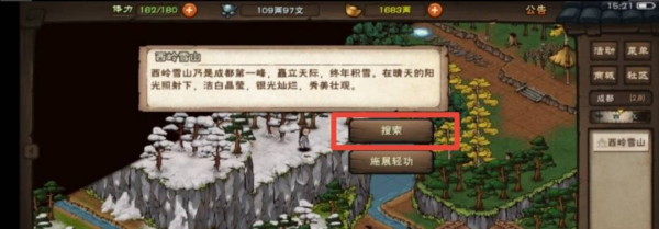3、一旦进入西岭雪山界面,玩家需要在此处采取行动,点击屏幕上的搜索功能,探寻可能藏匿在积雪下的秘密。