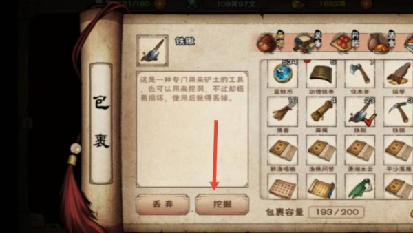 4、在执行搜索操作后,玩家会察觉到积雪下方似乎埋藏着什么不寻常的东西。这时,玩家需要打开包裹,在杂项类别中找到并装备铁锹工具,紧接着点击挖掘选项,开始进行挖掘工作。