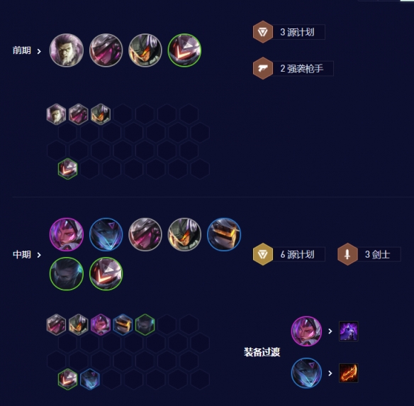 一般情况下2-1升4,2-5升5,3-2升6,4-1/4-2升7。前期尽量用强势棋子与羁绊打工,保证打工棋子2星,进而稳定血量健康。尽量使用利息升级,步入7与8阶段,7级、8级替换低费打工卡,向以4-5费棋子为核心阵容转型。