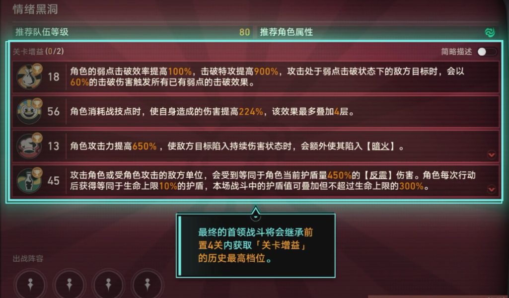 关卡增益选择:第一条的击破类增益,提高阮梅伤害与卡芙卡和黑天鹅的击破伤害与击破持续伤害;第三条持续伤害类增益,提高卡芙卡和黑天鹅的伤害。
