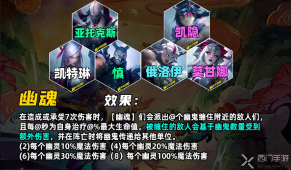 【幽魂】弈子造成7次伤害后会快速治疗20%最大生命值,并派遣一个幽灵扰乱附近的敌人。扰乱的敌人被攻击时会受到额外魔法伤害。敌人在死亡后会传递扰乱