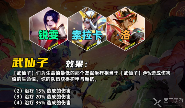 你的队伍获得护甲与魔抗。【武仙子】会根据造成伤害值的百分比对生命值最低的那个友军治疗