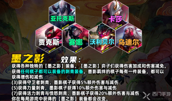 获得各种独特的【墨之影】装备。【墨之影】弈子们获得伤害加成和伤害减免。获得任何棋子都可以装备的刺青装备。墨影羁绊的棋子每有一件装备,都可以获得增伤和减伤