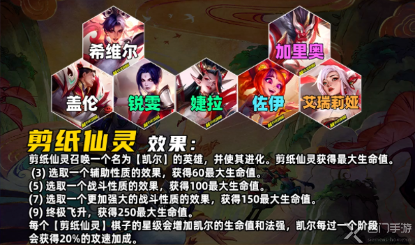 (10) 终极飞升,获得250最大生命值每个剪纸仙灵弈子的星级会增加天使的生命值和法强,并且每过一个阶段天使会获得20%的攻速加成