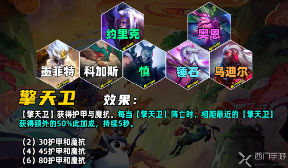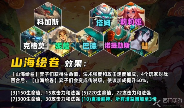 和S4的羁绊名称一样,但是效果不同,山海绘卷的弈子会获得生命值、攻击力和法强,经过4场战斗后,山海绘卷】弈子们会变成传说级,增益效果提升50%,实战中脚下有个和S4三国羁绊一样的圈