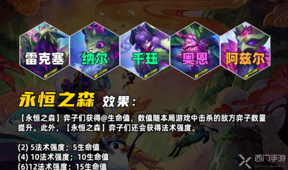 虽然和S4的名称一样,但是效果不同。敌方弈子死亡后,获得一层【土壤】层数,永恒之森弈子会从每层【土壤】层数中永久获得生命值加成,妥妥的成长性羁绊;此外每过4秒,还会获得法强