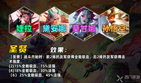 战斗开始时,弈子基于所处的格子位置获得加成处于前两排,获得全能吸血处于后两排,获得法强加成