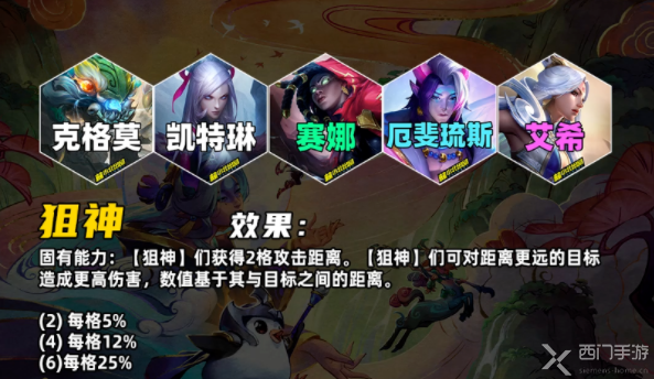 固有能力:狙神获得2格攻击距离狙神根据与目标之间的距离获得百分比额外伤害