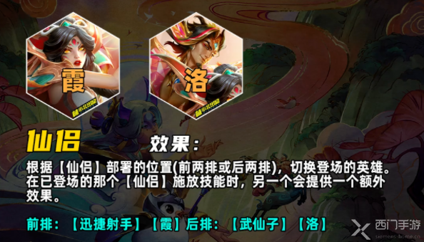 当一名登场的仙侣施法时,另一半会在场边提供额外增益霞登场时:洛会向生命值最低的n名友军投掷羽刃,为其治疗生命值。此技能会受到【迅捷射手】影响洛登场时:霞会对所有被洛技能命中的敌人造成物理伤害