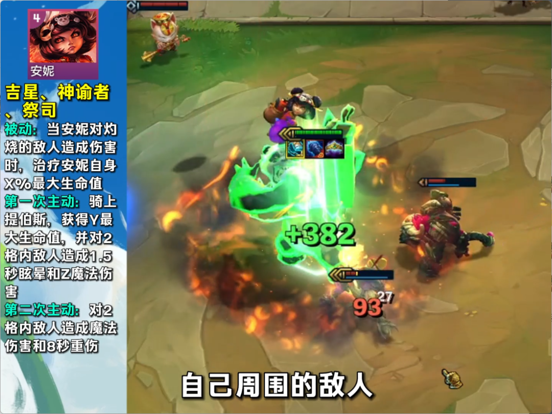 安妮:跳到提伯斯的身上,获得最大生命值加成。指挥提伯斯立即释放技能。