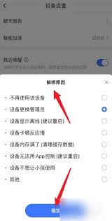 点击“解除绑定”按钮后,系统可能会要求您选择解绑的原因,如“设备更换”、“不再使用”等。请根据实际情况选择一个合适的选项,然后点击“确定”或“提交”。