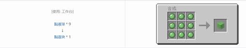 当收集到足够数量的史莱姆球后,就可以进行黏液块的合成了。合成黏液块需要在工作台中进行操作。将9个史莱姆球按照3x3的方式摆放在工作台的格子里。上方中间一格放置1个史莱姆球,上方左边和右边分别放置1个史莱姆球;中间左边、中间和中间右边同样各放置1个史莱姆球;下方中间一格放置1个史莱姆球,下方左边和右边分别放置1个史莱姆球。这样摆放好后,工作台就会自动合成出1个黏液块。